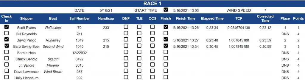 Thank you, Race Committee, for an excellent job setting up the course and the start of racing on time.